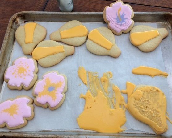 In addition to the hot air balloon cookies, I decide to make a few hibiscus cookies as well. Quite honestly, I chose that shape for two reasons; one because that shape is a smaller cutter and would make more cookies and two, because I had some leftover pink in the fridge from the previous cookie endeavor. I was pretty proud of myself for having my tubs of royal icing mixed up the previous night. My cookie friend over at Sweet & Saucy Life told us at the last class I took, that the colors really do better if they are mixed up the day before they are used. You might want to check her website out for her new virtual cookie club she has started! I just signed up this past weekend for it. You can find it here.