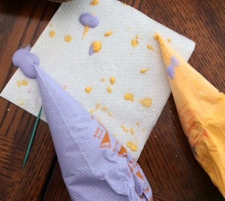 Another thing I wanted to share or confess, is the over filling of my tip less bag problem. For some reason, I feel like I can save time by filling those bags to the brim. Just take my advice, do not think you will save time later by filling them all the way! I always forget to save some room so I can tie them off. What do I do to try to fix my mistake? Aka : Make it work? I twist my bag, then fold it over and use a chip clip. Folks, that does not work! As Kala experienced, it will eventually explode and then you will need to make a RI sandwich cookie, as you can see with the hot air balloon cookie in the right hand corner of the cookie sheet. Sigh…..I eventually got the icing transferred into another bag, and went along my way. Shortcuts rarely are worth it.